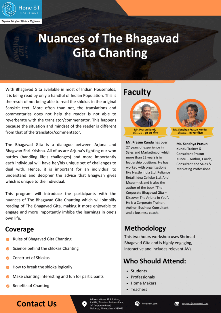 This program will introduce the participants with the nuances of The Bhagavad Gita Chanting which will simplify reading of The Bhagavad Gita, making it more enjoyable to engage and more importantly imbibe the learnings in one’s own life.