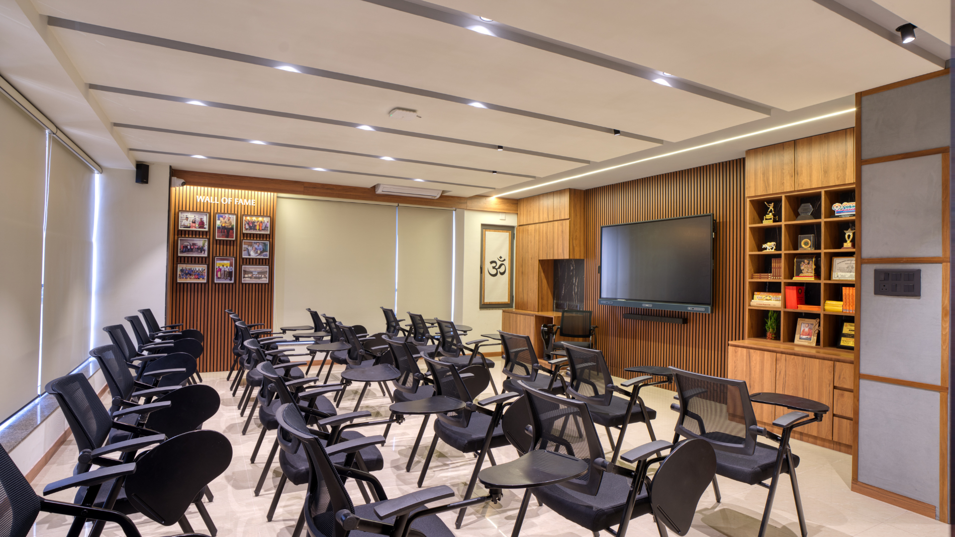 State of the Art facility equipped with a 75″ smart board, audio support, ergonomic seating, and a quiet professional atmosphere that helps enhance learning and output. Our training centre offers a modern, fully equipped space designed for short-term use, making it ideal for one-day and two-day events. The setup functions seamlessly as a conference hall, seminar hall, meeting room, or even a compact podcast studio for recording sessions and interviews. With a large HD display, high-speed internet, comfortable seating, and AV support, the venue works well for workshops, coaching batches, product demos, team training sessions, or video shoots. Many organisers also use the space as an alternative to traditional conference rooms, appreciating the convenience of quick and hassle-free conference room booking. Available for rent from an hour to full day.